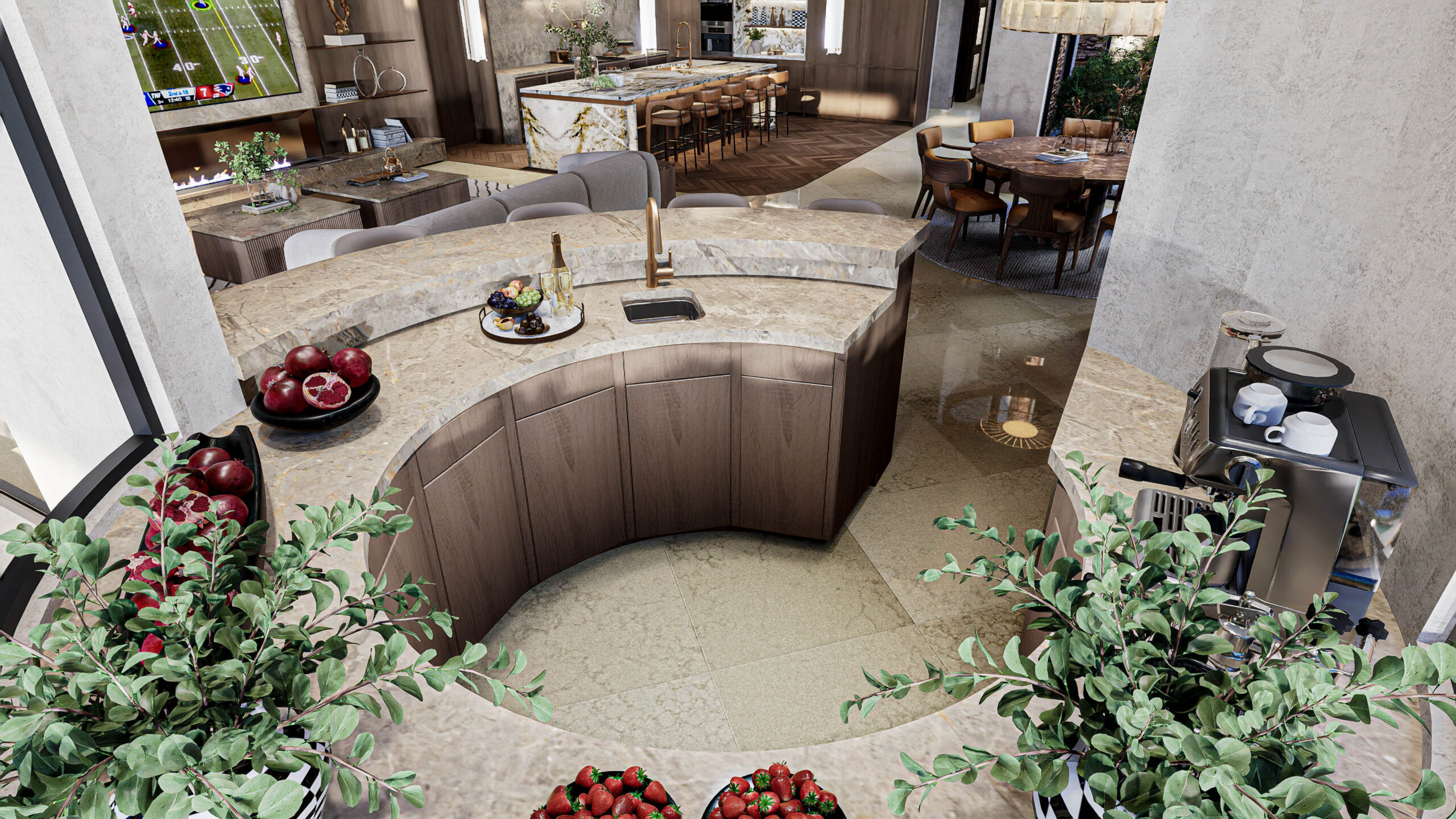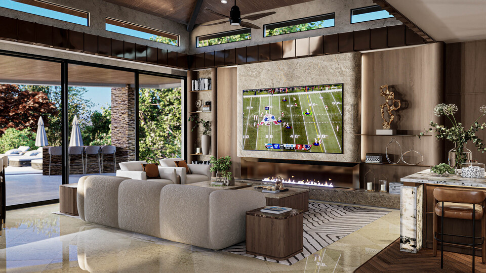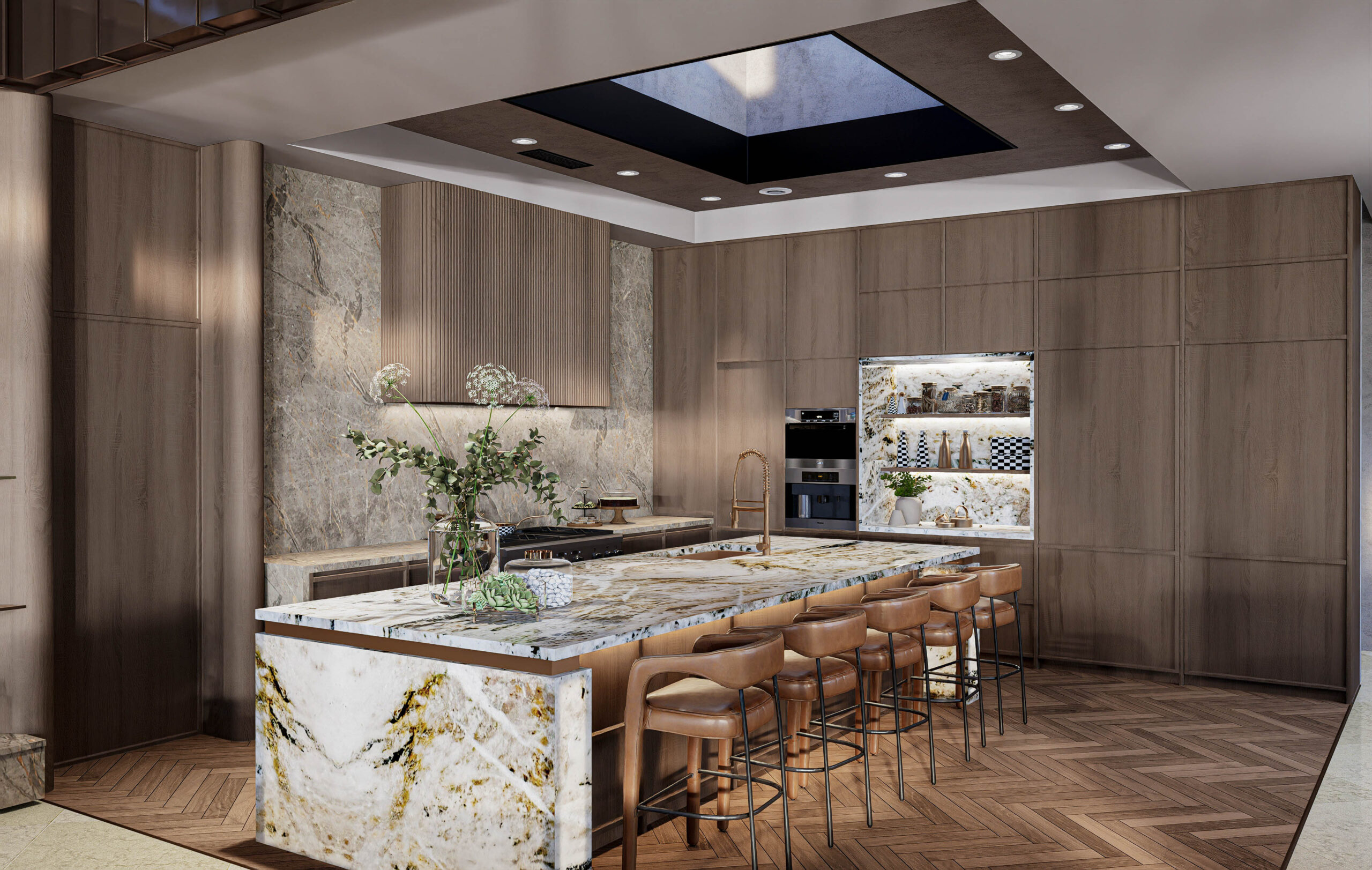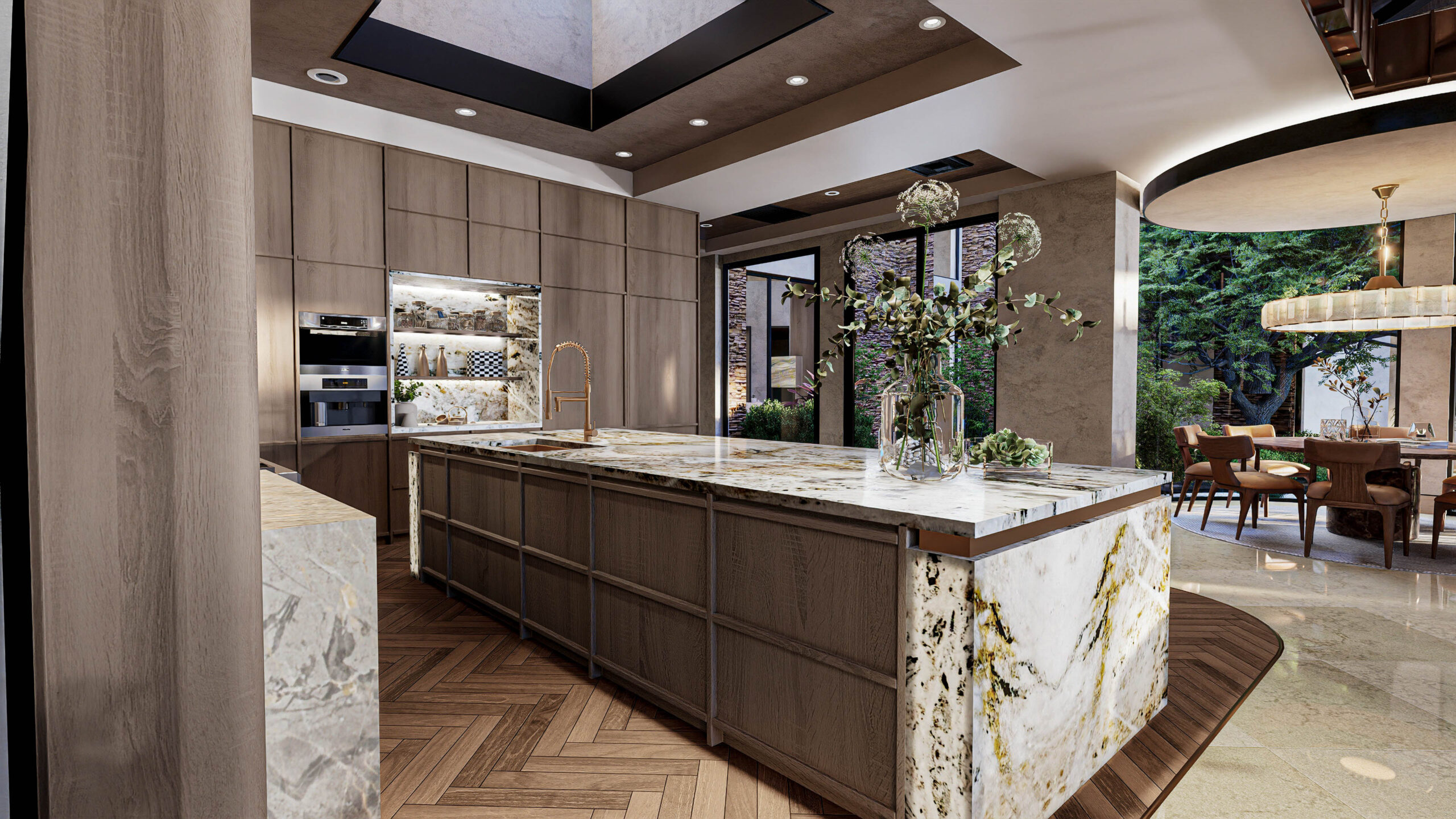 Soaring ceilings clad in natural wood, expansive stone surfaces, and bespoke millwork define the home’s grand yet warm aesthetic.