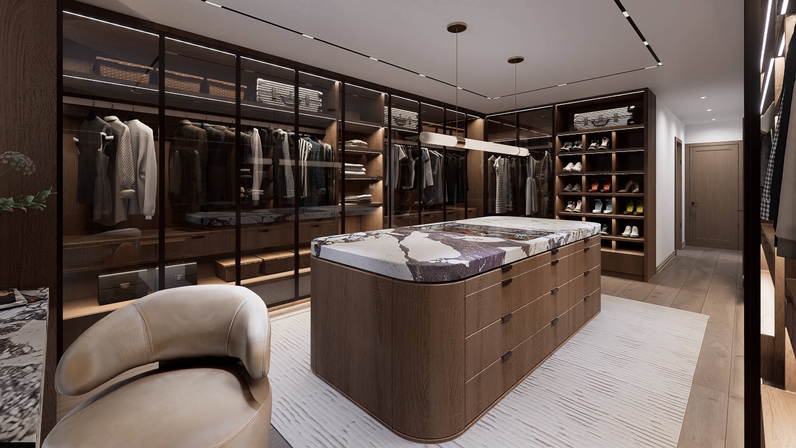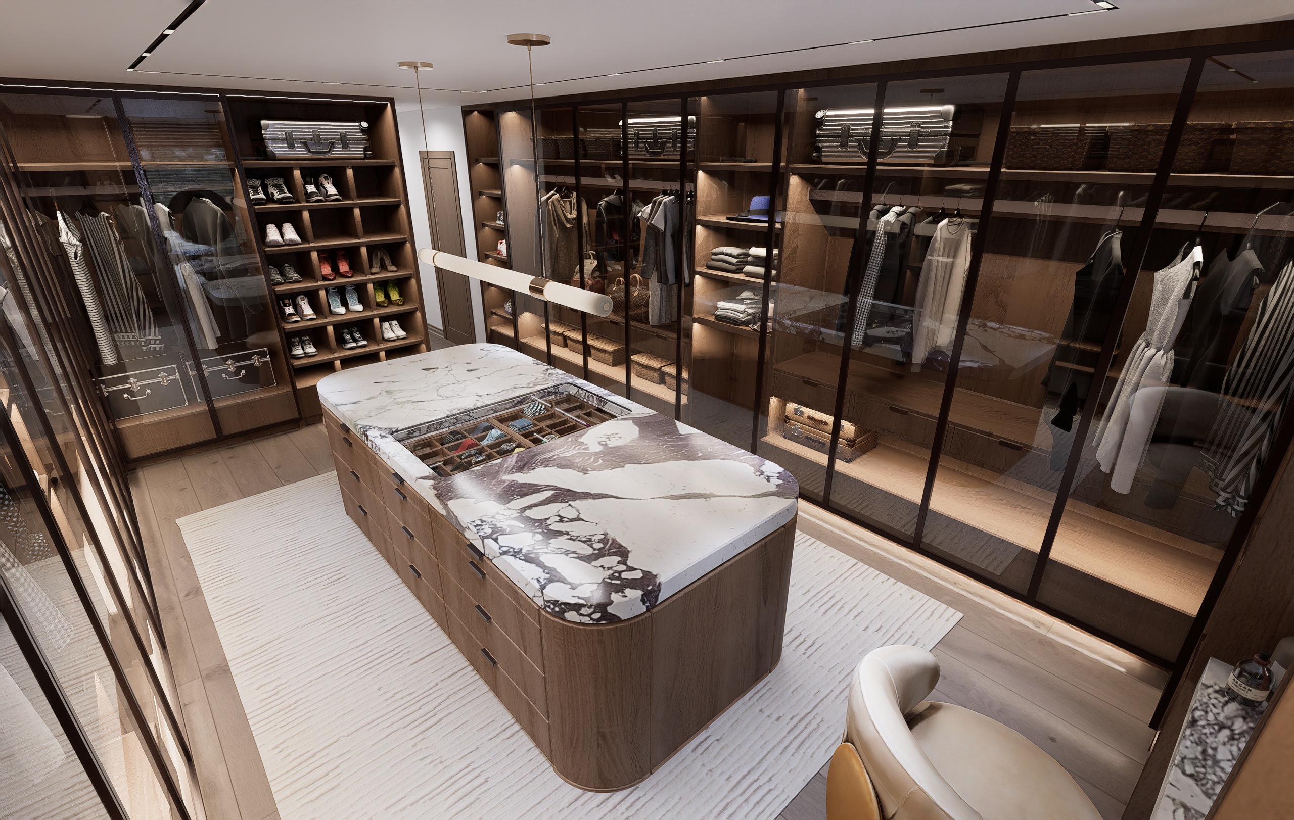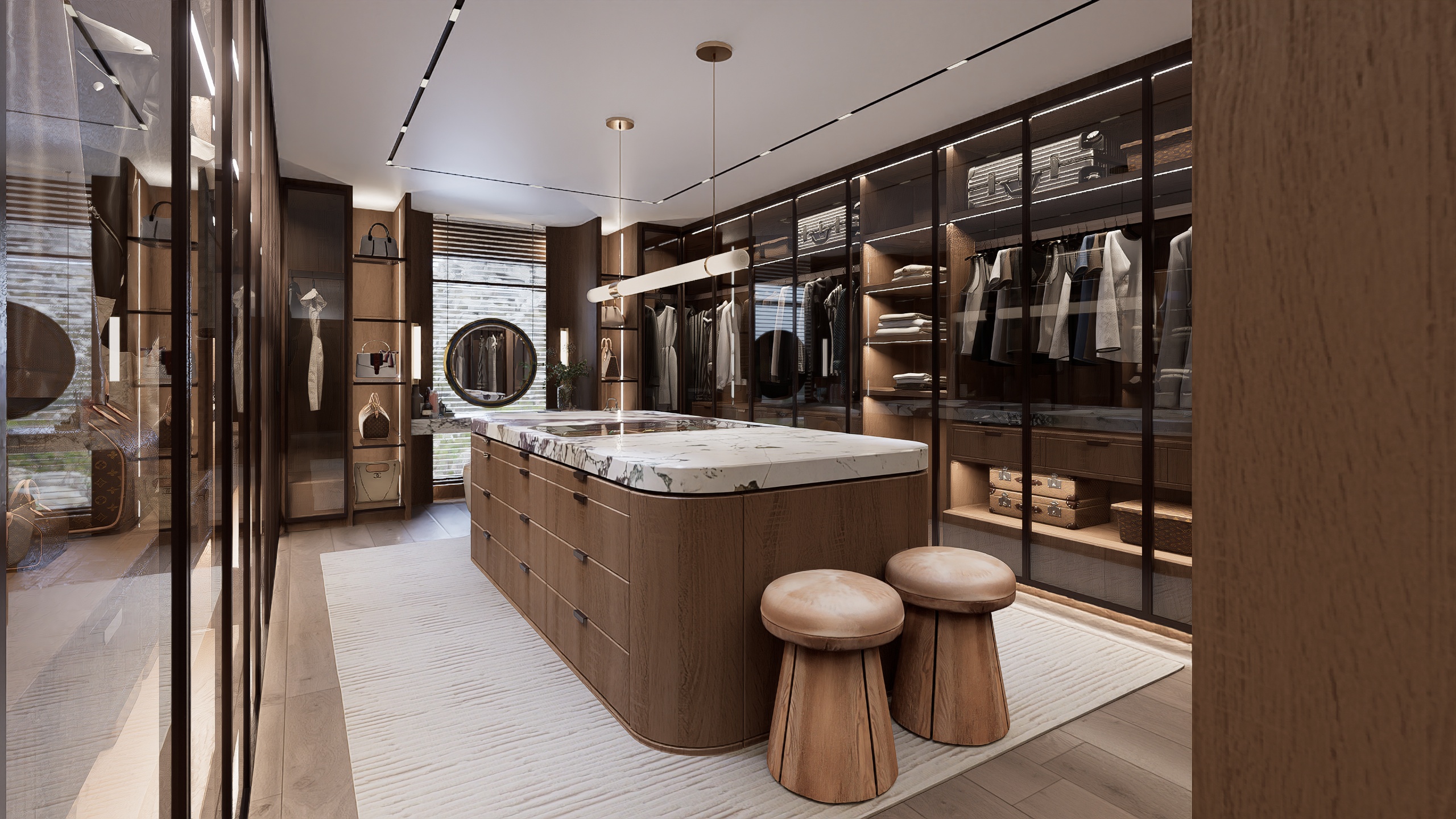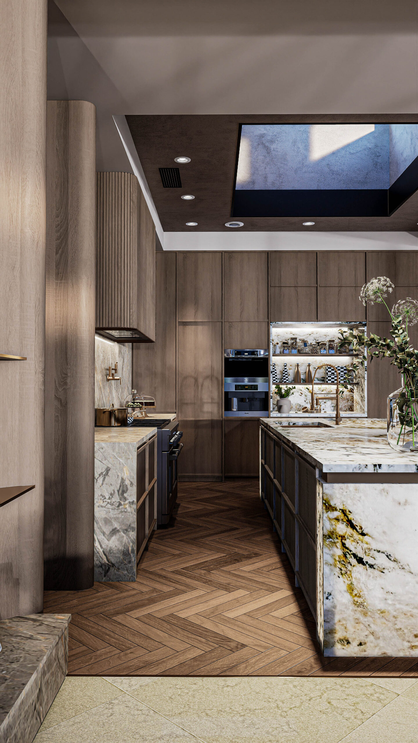Soaring ceilings clad in natural wood, expansive stone surfaces, and bespoke millwork define the home’s grand yet warm aesthetic.